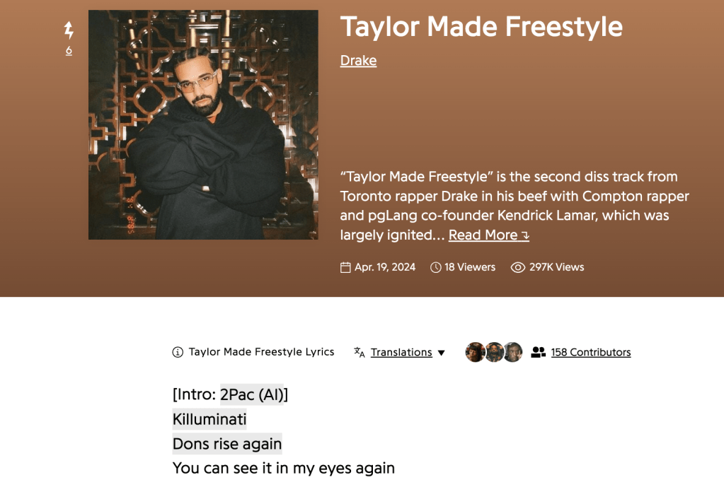 The most controversial aspect of the track was the use of AI voice cloning to incorporate verses from Tupac and Snoop Dogg with the bulk of the criticism centering around what was suspected to be unauthorized use of the deceased Tupac’s likeness – the track begins with Tupac’s voice rapping a verse goading Kendrick to respond. A week later, these suspicions were confirmed with Tupac’s estate filing a cease and desist against Drake to take down the track.